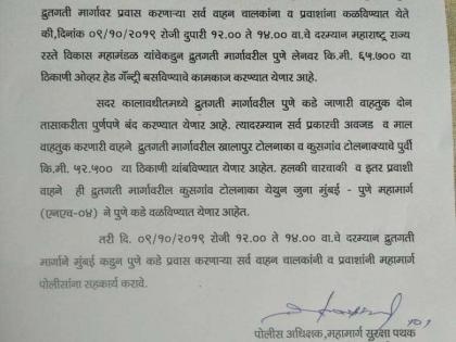 त्यामुळे बुधवार दि. 9 ऑक्टोबर रोजी दुपारी 12 ते 2 या काळात मुंबई-पुणे द्रुतगती महामार्गावरून पुण्याकडे जाणारी वाहतूक पूर्णपणे बंद ठेवण्यात येणार आहे. या काळात सर्व प्रकारची अवजड आणि मालवाहतूक करणारी वाहने द्रुतगती महामार्गावरील खालापूर टोल नाका आणि कुसगाव टोलनाक्यापूर्वी 52.500 किमी अंतरावर थांबवण्यात येतील. तर हलकी चारचाकी वाहने आणि अन्य प्रवासी वाहने ही कुसगाव टोलनाक्यावरून जुना मुंबई-पुणे महामार्गावरून वळवण्यात येतील.