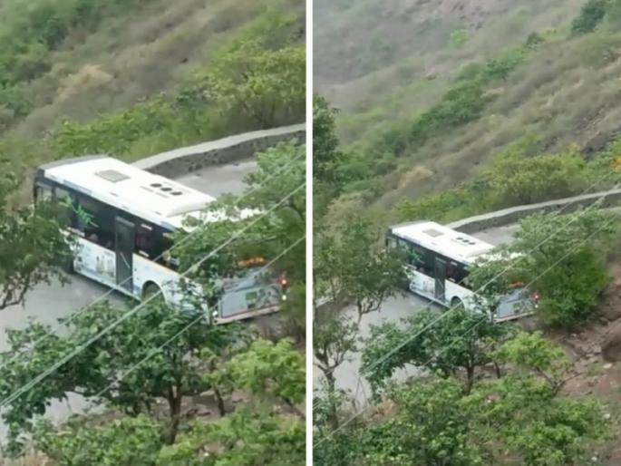 तीव्र उतारावरील वळणावरून चालकाचे नियंत्रण सुटल्याने ई बस कठड्याला जोरदार धडकली. सुदैवाने बस कठड्याला अडकल्याने बसमधील प्रवासी बचावले आहेत. हा अपघात शुक्रवारी दुपारी साडेबाराच्या सुमारास सिंहगडावरून बस खाली येताना घडला. सिंहगडावरून खाली कठड्याला लागून साधारण सातशेहून मिटरचे दरी आहे. बस मध्ये पस्तीस ते चाळीस प्रवासी प्रवास करत होते. आज दुपारी साडेबाराच्या दरम्यान ही घटना घडली. शुक्रवारी दुपारी सिंहगडावर गेलेल्या ई बस पैकी एक बस परत सिंहगडावरून खाली येताना पहिल्याच तीव्र उतारावरील वळणावर वळताना चालकांचे नियंत्रण सुटल्याने रस्त्याच्या कठड्याला धडकली. सुदैवाने कठड्याला बस अडकल्याने सर्व प्रवासी बचावले. यावेळी बसमधून पस्तीस ते चाळीस प्रवासी प्रवास करत होते.