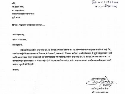 मी माजिद अमीन शेख वॉर्ड क्रमांक ८४ शाखा अध्यक्ष प्रभाग क्रमांक १८ आपणास या पत्राद्वारे कळवत आहे कि, मागील काही दिवसात पक्षात विकास, बेरोजगारी, महागाई, शिक्षण, महिला सक्षमीकरण, हे मुद्दे सोडून जात - धर्म या विषयावर भर दिला जात आहे. या कारणास्तव मी माजिद अमीन शेख कोणाच्याही दबावाखाली न येता स्वइच्छेने पदाचा राजीनामा देत आहे. माझ्या पदाचा राजीनामा स्वीकारून याची पोहोच द्यावी हि विनंती असे पत्रात नमूद करण्यात आले आहे.
