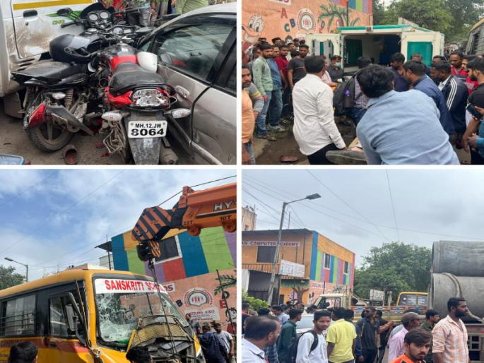 पुणे : कात्रजकोंढवा रस्त्यावर आज सकाळी नऊ वाजता भीषण अपघात झाला आहे. कात्रजकोंढवा रस्त्यावरील कोंढवा येथील स्मशानभूमी जवळ माजी आमदार योगेश टिळेकर यांच्या कार्यालयासमोरच हा अपघात झाला. सदर अपघातामध्ये एकूण दहा गाड्यांचे प्रचंड मोठ्या प्रमाणावर नुकसान झाले असून त्यामध्ये एक व्यक्ती ठार झाला आहे. तर पाच व्यक्ती गंभीर जखमी आहेत. तसेच काही शाळकरी मुलेही जखमी झाल्याचे समजते आहे.