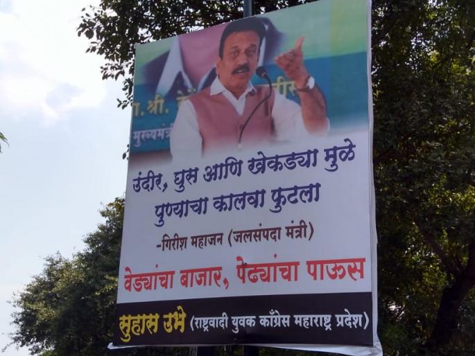 गुरुवारी सकाळी 11 च्या सुमारास मुठा कालवा फुटल्याने एकच हाहाकार उडाला. दांडेकर पुलाजवळील वसाहतीत कालव्याचे पाणी शिरल्याने येथील घरांचे माेठे नुकसान झाले. अनेकांचे सामान पाण्यात वाहून गेले, तर काहींचा संसार उघड्यावर पडला. कालव्याशेजारी टाकण्यात अालेल्या अनधिकृत केबल्समुळे हा कालवा फुटल्याची शक्यता वर्तवण्यात येत हाेती. परंतु हा कालवा केबल्समुळे नाही तर उंदीर, घुस, खेकड्यांनी जमीन पाेखरल्याने फुटल्याचा अजब शाेध पाटबंधारे खात्यातील अधिकाऱ्यांनी लावला हाेता. तसेच गिरीश महाजनांनी सुद्धा उंदीर, घुशी मुळेच हा कालवा फुटल्याची शक्यता असल्याचे वक्तव्य केले हाेते. त्यांच्या वक्तव्यावर राष्ट्रवादी युवक काॅंग्रेसने टीका केली अाहे. झाशीची राणी चाैकात लावण्यात अालेल्या फ्लेक्समध्ये महाजनांचा फाेटाे वापरण्यात अाला असून त्याखाली त्यांचे वक्तव्य लिहिण्यात अाले अाहे. त्याचबराेबर त्या खाली वेड्यांचा बाजार, पेढ्यांचा पाऊस असे लिहीण्यात अाले अाहे.