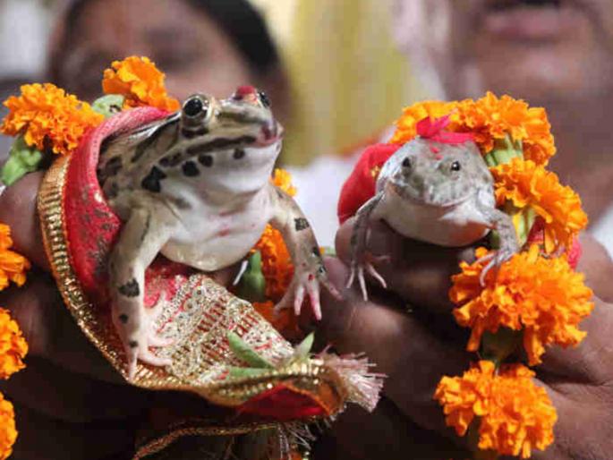 दक्षिण भारतात आणि ईशान्य भारतामध्ये मॉन्सून येण्यापूर्वी बेडकांचे लग्न लावले जाते. त्याला मंडूक परिणय म्हणतात. त्यांचे लग्न लावून पूजा करून पाण्यात सोडण्यात येते. त्यामुळे वरूणराजा प्रसन्न होऊन चांगला पाऊस पाडतो, अशी तेथील नागरिकांची श्रध्दा आहे. त्यासाठी दरवर्षी मे-जून महिन्यात बेडकांचे लग्न लावले जाते. उत्तर प्रदेशमध्ये बेडकाचे अतिशय सुंदर असे मंदिर देखील आहे. बेडकाची भव्यदिव्य अशी प्रतिकृती तयार केलेली आहे.