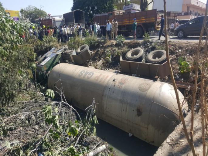 चाकण- तळेगाव रस्त्यावर गॅस टँकर ओढ्यात उलटला