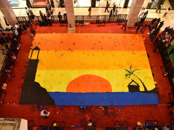 पुणे : पव्हीलीयन मॉल मध्ये महिला दिनानिमित्त साडेतीनशे महिलांनी आपल्या पायांच्या ठशांनी भव्य चित्र साकारले. विविध क्षेत्रातील साडेतीनशे महिला एकत्र येऊन एका भल्या मोठ्या कॅनव्हास वर पायांच्या ठशांनी चित्र साकारत आहेत, हे दृश्य विलक्षण होते. सेनापती बापट मार्गावरील पव्हीलीयन मॉल मध्ये महिला दिनी पुण्यातील वेगवेगळ्या क्षेत्रातील ३५० महिलांनी हे सुंदर चित्र रंगवत समानतेचा संदेश दिला. या वर्षी महिला दिनाची संकल्पना हाेती , समानतेचा विचार करा, बदलासाठी नवीन विचार करा,स्मार्ट कृती करा,'. तोच संदेश या चित्रातून देण्यात आला.