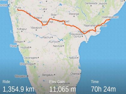 पुणे : आराेग्याचा, पर्यावरण रक्षणाचा संदेश देण्यासाठी पुण्यातील सुनिल कुकडे यांनी सायकलवरुन पुणे ते विषाखापट्टणम पर्यंत 1355 किलाेमीटरचा प्रवास केला. दरराेज 200 किलाेमीटर सायकलिंग करुन हा प्रवास 70 तासांमध्ये पूर्ण केला. विशेष म्हणजे या प्रवासात त्यांनी काेणाचीही मदत घेतली नाही. एकट्याने हा संपूर्ण प्रवास केला असून, यातून त्यांना आराेग्याचा संदेश द्यायचा आहे.