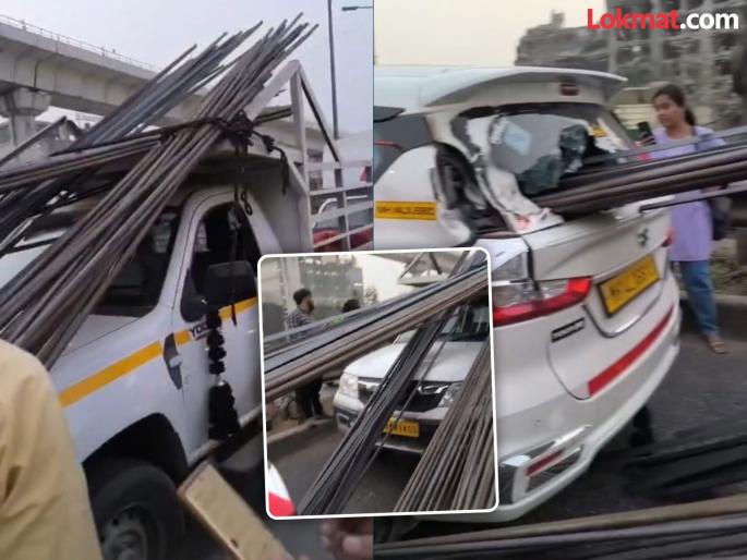 Web Summary : A terrifying accident occurred on the Pune-Bangalore highway when iron rods from a truck pierced a car. The driver miraculously survived. Improperly secured cargo caused the incident. Police are investigating the negligent transport.