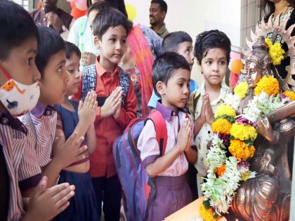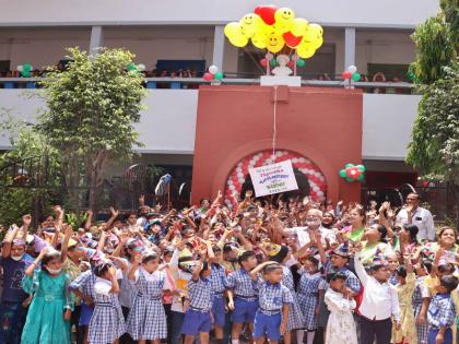 फुगे हवेत उडवून जल्लोषात शाळेत प्रवेश