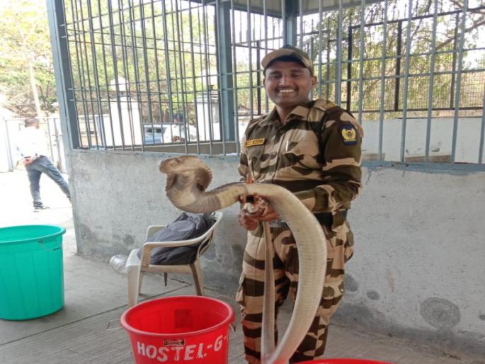विद्यापीठात शुक्रवारी (दि.२६) मुलांच्या वसतिगृहाजवळ आढळलेल्या 'किंग कोब्रा' चे पुनर्वसन विद्यापीठाचे सुरक्षारक्षक सुनील माळी यांनी केले. माळी यांनी या किंग कोब्राला पकडून सुरक्षित ठिकाणी जंगलात सोडले.