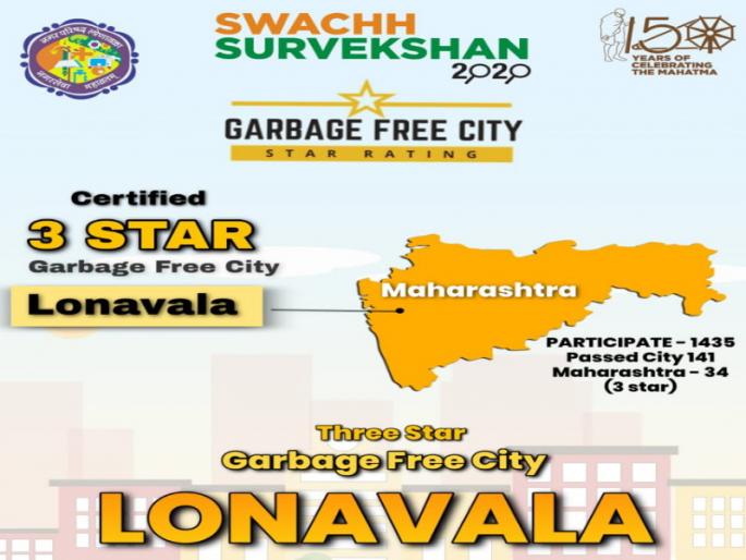 लोणावळा : केंद्र शासनाच्या वतीने घेण्यात आलेल्या कचरामुक्त शहर स्पर्धेत लोणावळा शहराला ‘थ्री स्टार’ मानांकन प्राप्त झाले आहे. या स्पर्धेत संपूर्ण देशातून 1435 शहरांनी सहभाग नोंदविला होता. यापैकी फक्त 141 शहरांना नामांकन प्राप्त झाले आहे. देशभरातील 6 शहरांना फाईव्ह स्टार मानांकन, 64 शहरांना थ्री स्टार मानांकन व 71 शहरांना वन स्टार मानांकन प्राप्त झाले आहे. या 64 शहरातून महाराष्ट्रामधील फक्त 34 शहरांनी 3 स्टार मानांकन प्राप्त झाले आहे.