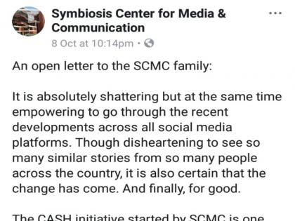 सिंबायाेसिस सेंटर फाॅर मिडीया अॅन्ड कम्युनिकेशन विभागातील अाजी व माजी विद्यार्थिनींनी साेशल मिडीयावर लिहीत सिंबायाेसिसमध्ये लैंगिक अत्याचार झाल्याचे म्हंटले अाहे.