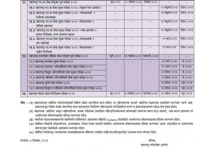 राज्यसेवा परीक्षा 2019 ,महाराष्ट्र दुय्यम सेवा मुख्य परीक्षा, महाराष्ट्र गट क सेवा संयुक्त व मुख्य परीक्षा, महाराष्ट्र वनसेवा मुख्य परीक्षा, कृषी सेवा परीक्षा, विद्युत अभियांत्रिकी सेवा परीक्षा, राज्यसेवा परीक्षा २०२२ आदी परीक्षांचे संभाव्य वेळापत्रक आयोगाच्या संकेतस्थळावर उपलब्ध आहे.