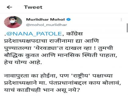 मोहोळ म्हणाले, नाना पटोले यांनी काँग्रेस प्रदेशाध्यक्षपदाचा राजीनामा द्या. आणि पुण्यातल्या 'येरवड्या'त दाखल व्हा. तुमची बौद्धिक कुवत आणि मानसिक स्थिती पाहता, हेच योग्य असल्याचे त्यांनी सांगितले आहे. तर नावापुरता का होईना, पण 'राष्ट्रीय' पक्षाच्या प्रदेशाध्यक्षाने मा. पंतप्रधानांबद्दल काय बोलावं, याचं काडीचही भान असू नये? असा सवालही मोहोळ यांनी उपस्थित केला आहे.