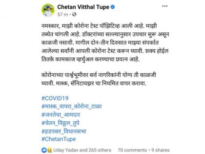 चेतन तुपे यांनी आपली कोरोना चाचणी पॉझिटिव्ह आली असून तब्येत चांगली असल्याचं पोस्टमध्ये म्हटलं आहे. यासोबतच गेल्या दोन-तीन दिवसांपासून त्यांच्याशी संपर्कात आलेल्यांनी कोरोनाची चाचणी करुन घ्यावी, असं आवाहनही तुपे यांनी केलं आहे.