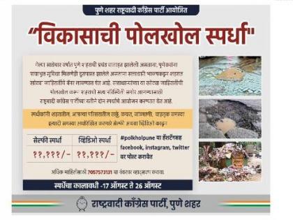 राष्ट्रवादी काँग्रेसकडून 'विकासाची पोलखोल' या स्पर्धा जाहीर केली आहे. शहराध्यक्ष प्रशांत जगताप यांनी या स्पर्धेची घोषणा केली आहे. यामध्ये पुण्यातील नागरिकांनी व्हिडिओ आणि सेल्फी फोटो पोस्ट करणार्या विजेत्या स्पर्धकास बक्षीसं देखील दिली जाणार आहेत. आपल्या भागातील समस्येचा फोटो किंवा व्हिडिओ संबधित व्यक्तीने #polkholpune या हॅशटॅगवर पोस्ट करायचा आहे. या स्पर्धेत विजेत्यांना प्रत्येकी ११,१११ रुपये असे बक्षीस दिले जाणार आहे.