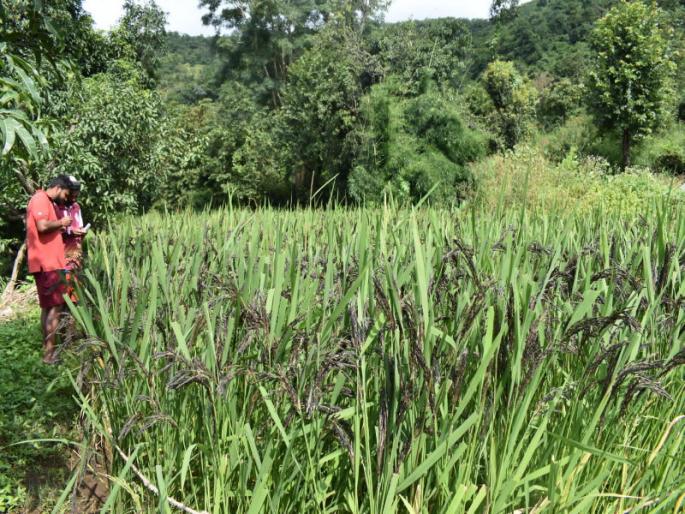 डिंभे : आंबेगाव तालुक्याच्या आदिवासी भागात पारंपरिक भात शेतीची लागवड केली जाते. मात्र, यंदा आसाम आणि इंडोनेशियातून घेतल्या जाणाऱ्या निळ्या भाताची लागवड तालुक्याच्या आदिवासी भागात पहिल्यांदाच करण्यात आली आहे. सध्या या भातपिकाच्या लोंब्या लगडल्या आहेत. निळसर काळ्या रंगाच्या भात लोंब्या शेतकऱ्यांच्या कुतूहलाचा विषय ठरल्या आहेत. कृषी विभागाच्या पुढाकाराने या भाताची लागवड करण्यात आली असून, या प्रकारचा हा जिल्ह्यातील पहिलाच प्रयोग आहे.
