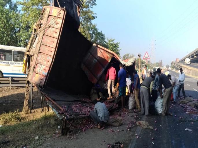 लोणावळा - मुंबई-पुणे एक्स्प्रेस वेवर भरधाव वेगाने जाणारा कांद्याचा ट्रक वलवण गावाजवळ चालकाचा गाडीवरील ताबा सुटल्याने उलटला आहे. या अपघातात ट्रक चालक गंभीर जखमी झाला आहे. कांद्याचा ट्रक उलटल्याची माहिती समजताच परिसरातील नागरिकांनी कांदा पळवण्यासाठी मोठी झुंबड होती. आज सकाळी पावणे सहा वाजण्याच्या सुमारास हा अपघात झाला.