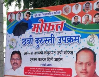 पुण्याचे खासदार गिरीश बापट यांचे नाव असलेली बीजेपीची बिघडलेली छत्री काँग्रेसच्या छत्री दुरूस्ती केंद्रावर