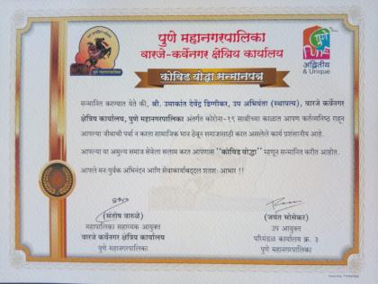 त्याची सुरुवात वारजे-कर्वेनगर क्षेत्रीय कार्यालयापासून करण्यात आली. क्षेत्रीय कार्यालयांतर्गत काम करणाऱ्या सफाई कर्मचारी, केटरींग व्यवस्था पाहणारे कर्मचारी, डॉक्टर, नर्सेस इत्यादी ५० जणांचा कोविड योद्धा म्हणून उपायुक्त जयंत भोसेकर यांच्या हस्ते सन्मान करण्यात आला. या प्रसंगी सहायक आयुक्त संतोष वारूळे, स्थापत्य विभागाचे उप अभियंता उमाकांत डीग्गीकर आदी उपस्थित होते.