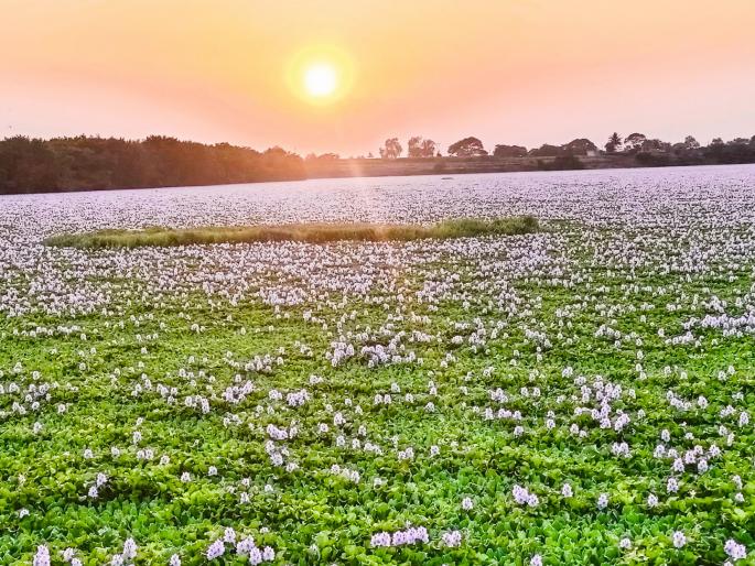 जलपर्णीच्या फुलांनी बहरली भीमा; हातवळण येथे निसर्गरम्य दृश्य पाहण्यासाठी पर्यटकांची गर्दी