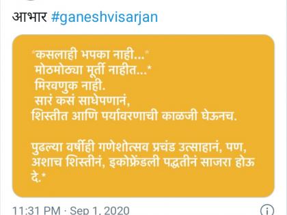 पुण्यातील गणेश विसर्जन सोहळ्याला तशी फार प्रदीर्घ परंपरा आहे. हा सोहळा पाहण्यासाठी देश विदेशातून लोक पुण्यात येतात. येथील विसर्जन सोहळ्यातील आकर्षक सजावट केलेल्या मिरवणुका, ढोल ताशांचे जल्लोष पूर्ण उत्साहात होणारे वादन, डीजेच्या तालावर एक दिवसांच्या वर चालणारा हा सोहळा डोळ्यांचे पारणे फेडणारा असतो. मात्र या कालावधीत पर्यावरणाची देखील मोठी हानी होते. तसेच नागरिकांच्या आरोग्यही धोक्यात येते. तसेच पोलीस यंत्रणेवर देखील प्रचंड ताण येत असतो. पण यंदा कोरोनामुळे सर्वत्रच गणेशोत्सवावर मर्यादा आल्या तशा पुण्यात सुद्धा होत्या. त्यामुळे अगदी साधेपणाने गणेशाची मनोभावे सेवा करून ना मोठे देखावे, ना मंडप, ना मिरवणूका असे सर्वकाही दरवर्षीचा थाटमाट बाजूला ठेवत अगदी साधेपणाने व वेळेत गणेश विसर्जन सोहळा संपन्न झाला.