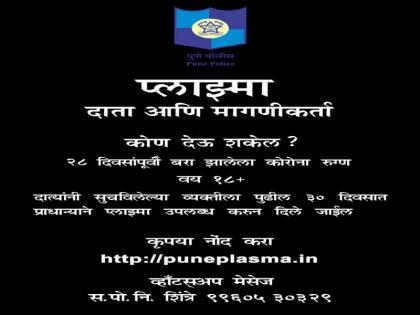 प्लाझ्मा दान करु इच्छिणारे व प्लाझ्माची गरज असलेल्यांसाठी पुणे प्लाझ्मा अॅप सुरु करण्यात आले आहे. पुणे प्लाझ्मा डॉट इन या अॅपवर संपर्क साधता येईल. प्लाझ्मा दाते आणि रुग्ण यांच्यात समन्वय साधण्यासाठी पोलीस उपायुक्त मितेश घट्टे यांच्या मार्गदर्शनाखाली सहायक पोलीस निरीक्षक प्रिती शिंत्रे (९९६०५३०३२९) या काम पहात आहेत.