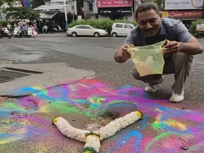 पुणे : शहरातील अनेक रस्त्यावर पावसाळा सुरू होण्यापुर्वीच खड्डे पडलेले आहेत. त्यामुळे हे खड्डे दुरूस्ती करावी या मागणीसाठी एका नागरिकाने महर्षी कर्वे पुतळा चौकात पालकमंत्री चंद्रकांत पाटील यांच्या कार्यालयासमोर खड्ड्याच्याभोवती रांगोळी काढली आहे. या खड्ड्याला हार अर्पण करून अनोखे आंदोलन केले आहे.