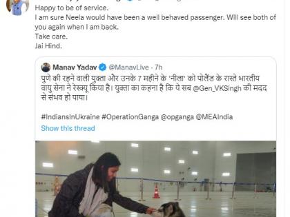 पुण्यातील युक्ता नामक विद्यार्थीनीने आपल्या लाडक्या नीला या श्वानासह भारतात येण्याची विनंती केली. पोलँडमार्गे वायू सेनेच्या मदतीने युक्ता आणि निला दोघेही सुरक्षित भारतात परत आले. यासाठी, मंत्री जनरल व्हि.के. सिंग यांनी मोलाची मदत केल्याचं युक्ताने म्हटले आहे. तर, व्हि.के.सिंग यांनीही ट्विट करुन लवकरच युक्ता आणि नीलाला भारतात भेटू असे म्हटलंय. तसेच, या सेवेचा मला आनंद होत आहे, जय हिंद... असेही त्यांनी म्हटले.