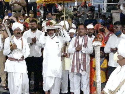 श्री संत तुकाराम महाराजांच्या पादुका घेऊन पंढरपूरला गेलेले पालखी सोहळा प्रमुख भानुदास महाराज मोरे, संजय महाराज मोरे, अजित महाराज मोरे, संस्थानचे अध्यक्ष नितीन महाराज मोरे, विश्वस्थ माणिक महाराज मोरे, संतोष महाराज मोरे, विशाल महाराज मोरे सेवकरी हे पादुकासह खाली उतरले व येथून उपस्थित भाविकांनी टाळ मृदंगाच्या गजरात मंदिराकडे निघाल्या. यावेळी भाविकांनी व ग्रामस्थांनी रस्त्याच्या दुतर्फा उभे राहुन पादुकांचे जोरदार स्वागत केले. पादुका गावातील हनुमान मंदिराच्या समोर येताच अभंग घेण्यात आला. टाळ मृदंगाच्या तालावर अभंग म्हणत मंदिराकडे पादुका नेण्यात आल्या. गावात पालखी मार्गावर रांगोळींच्या पायघड्या घालण्यात आल्या होत्या.