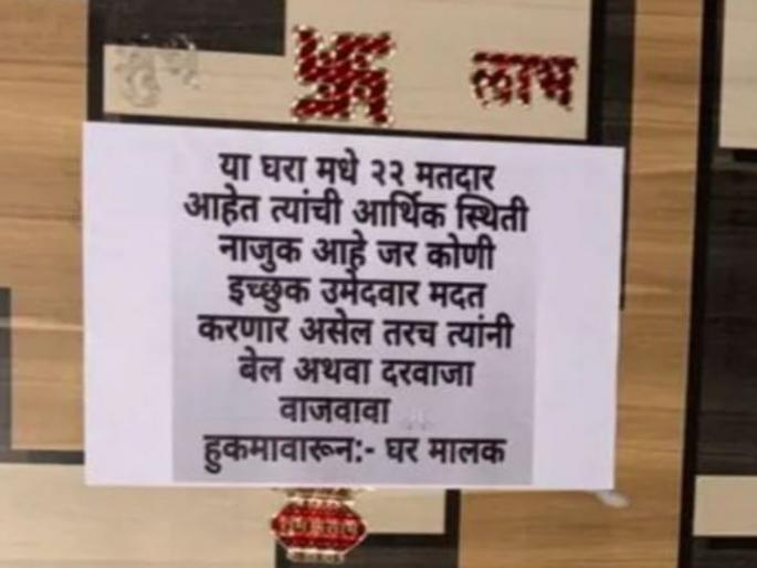‘या घरात २२ मतदार आहेत. त्यांची आर्थिक स्थिती नाजूक आहे. तर कोणी इच्छूक उमेदवार मदत करणार असेल तरच त्यांनी बेल अथवा दरवाजा वाजवावा’ हुकमावरून : घर मालक