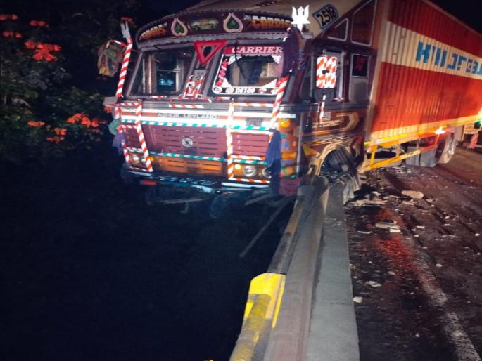 राजगुरुनगर : पुणे - नाशिक महामार्गावर भिमानदी पुलाचे संरक्षक कठडे तोडत ट्रक चक्क अर्ध्यावर लटकला. सुदैवाने ट्रक नदीपात्रात कोसळला नसल्याने मोठा अनर्थ टळला. तसेच जीवीतहानी टळली. हि घटना ७ तारखेला पहाटे पाच वाजण्याच्या सुमारास घडली.