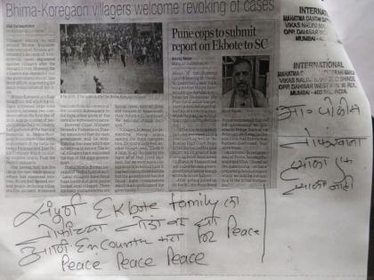 कोरेगाव-भीमा येथील हिंसाचार प्रकरणी मिलिंद एकबोटे यांना पोलिसांनी अटक केली असून सध्या येरवडा कारागृहात त्यांची रवानगी करण्यात आली आहे. एकबोटे यांना धमकीचे आलेले हे दुसरे पत्र असून यापूर्वी फेब्रुवारी महिन्यामध्ये असेच एक पत्र आले होते. याबाबत प्रो. ए. सोसायटीचे कार्याध्यक्ष डॉ. गजानन एकबोटे यांनी सांगितले की, चार पोस्टकार्ड एकत्र करुन एक पत्र तयार केले आहे. त्याला एका इंग्रजी वृत्तपत्राचे कात्रण जोडून त्यावर हाताने संपूर्ण एकबोटे फॅमिलीला तोफांच्या तोंडी द्या आणि एन्काऊंटर करा, असा मजकूर लिहिलेला आहे. या पत्राची दखल घेऊन डॉ. एकबोटे यांनी गुरुवारी शिवाजीनगर पोलीस ठाण्यात तक्रार दिली आहे.