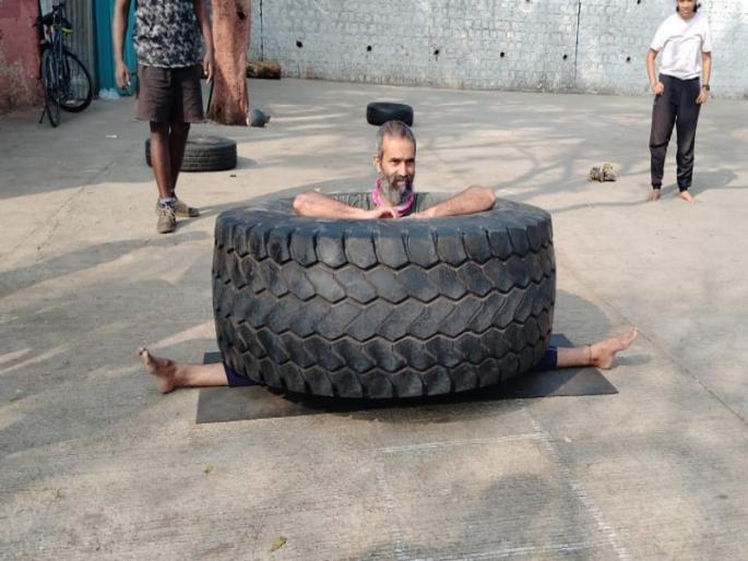 धनकवडी: योग: कर्मसु कौशलं ! असं म्हटलं जातं. कौशल्याने कठीण कामही साध्य होते, हे योगाभ्यासक विठ्ठल कडू यांनी सिद्ध केले. तळजाई टेकडी येथे समकोणासन (स्ट्रेच साईड स्प्लिट) करत त्यांनी तब्बल दोनशे वीस किलो वजनाचा क्रेन पोकलेन टायर पेलून दाखवला. त्यांच्या या कौशल्याची सर्वत्र चर्चा होत आहे.