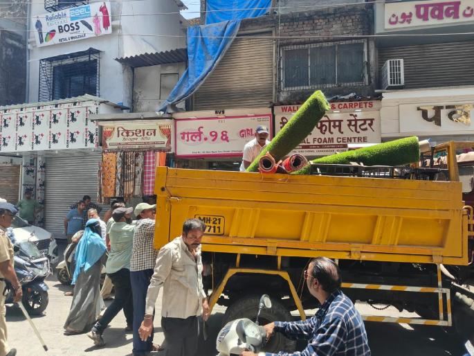 शहरातील दुकानदारांनी थेट फुटपाथवर विक्रीसाठी ठेवलेले साहित्य महापालिका अतिक्रमण पथकाने डंपरद्वारे उचलून नेले आहे. शहरात वेगवेगळ्या भागात ही कारवाई सातत्याने सुरू राहणार असल्याचे संकेत अतिरिक्त आयुक्त जमीर लेंगरेकर यांनी दिले आहे.