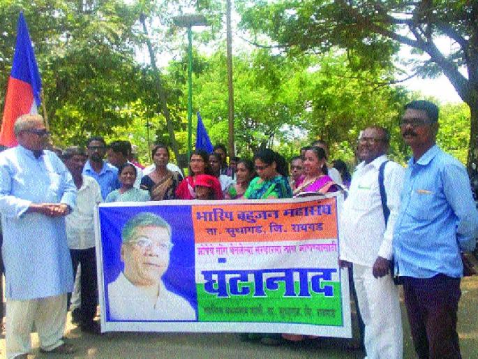 कर्जत - शासनाला झोपेतून जागे करण्यासाठी भारिप बहुजन महासंघ, भारतीय बौद्ध महासभा, सम्यक विद्यार्थी आंदोलन यांच्या संयुक्त विद्यमाने भारिप बहुजन महासंघाचे राष्ट्रीय अध्यक्ष अॅड. प्रकाश आंबेडकर यांच्या आदेशानुसार मंगळवारी तहसील कार्यालयावर घंटानाद आंदोलन करण्यात आले.तहसील कार्यालयाच्या बाहेर भारिप बहुजन महासंघाचे जिल्हा अध्यक्ष दीपक मोरे यांच्या अध्यक्षतेखाली विविध मागण्यांसाठी घंटानाद आंदोलन करण्यात आले. रिलायन्स व एचपीसीएल पाइपलाइनसंदर्भात अन्यायग्रस्त शेतकऱ्यांना न्याय मिळावा, चांदई येथील तासगावकर कॉलेजमध्ये सुरू असलेला संप व आंदोलनामुळे विद्यार्थ्यांचे नुकसान होत आहे त्यावर कायमस्वरूपी तोडगा काढावा, दहिवली येथील एचपी पेट्रोल पंपावरील कामगारांवर होणारा अन्याय दूर करावा या मागण्या करत शासनाचे लक्ष वेधण्यासाठी घंटानाद आंदोलन करण्यात आले. आंदोलनकर्त्यांनी तहसीलदार अविनाश कोष्टी यांची भेट घेवून त्यांना निवेदन सादर केले.अलिबागमध्ये तहसिलदार कार्यालय आणि जिल्हाधिकारी कार्यालयासमोर भारीप बहुजन महासंघ रायगडचे जिल्हाध्यक्ष प्रदीप ओव्हाळ यांच्यासह कार्यकर्त्यांनी सरकारच्या विरोधात घोषणा दिल्या.विविध मागण्यांचे निवेदन त्यांनी प्रशासनाला दिले. निवासी उपजिल्हाधिकारी किरण पाणबुडे यांना निवेदन स्वीकारले.सुधागड तालुक्यात तहसीलदारांना मागण्यांचे निवेदनराबगाव/पाली : सुधागड तहसीलदार कार्यालयासमोर भारिप बहुजन महासंघाकडून विविध मागण्यांसाठी घंटानाद आंदोलन करण्यात आले. कोरेगाव-भीमा हल्ल्याचे मुख्य सूत्रधारसंभाजी भिडे यांना त्वरित अटक करावी, या दंगलीत बहुजन बांधवांवरील नोंदवण्यात आलेले सर्व गुन्हे मागे घ्यावेत. तसेच अल्पसंख्याक विद्यार्थ्यांना १00 टक्के शिष्यवृती द्यावी, थकीत शिष्यवृती तत्काळ अदा करावी, शेतकºयांचा सात बारा कोरा करावा, आदिवासींचे स्थलांतर रोखण्यासाठी स्थानिक पातळीवर रोजगार उपलब्ध करून द्यावा, वाकण-पाली-खोपोली रस्ताबाधित शेतकºयांना नुकसान भरपाई देण्यात यावी आदी मागण्यांसाठी सुधागडमधील भारिप बहुजन महासंघाचे कार्यकर्ते तहसील कार्यालयासमोर उपस्थित होते.प्रकल्पग्रस्त शेतकºयांना योग्य न्याय मिळावापनवेल : भारिप बहुजन महासंघ, भारतीय बौद्ध महासभा, सम्यक विद्यार्थी आंदोलन पनवेलमधील समविचारी सामाजिक संघटना संस्था यांच्या वतीने पनवेल तहसील कार्यालयावर महाराष्ट्र शासनाला जागे करण्यासाठी घंटानाद आंदोलनाचे आयोजन करण्यात आले होते. यावेळी विविध मागण्यांचे निवेदन नायब तहसीलदार बी.टी. गोसावी यांना देण्यात आले. यावेळी रसायनी, पनवेलमधील ८ गावांच्या प्रकल्पग्रस्त शेतकºयांना योग्य न्याय मिळावा, अन्य