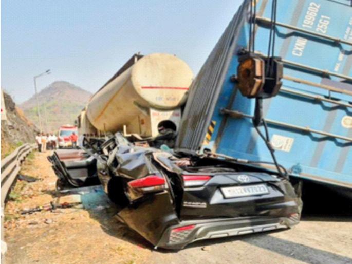 मुंबई-पुणे द्रुतगती मार्गावरून कंटेनर चालक अवधेश यादव (३७, उत्तर प्रदेश) हा कंटेनर घेऊन मुंबईकडे जात असताना खोपोली एक्झिटला धडक देऊन पुढे कारला धडक दिली. त्यानंतर कंटेनरने पुढे बल्करला मागून जोरदार धडक दिली. अपघातात कारमधील श्रीकांत जाधव ( ६३, पुणे), अंबादास पेटारे (पुणे), प्रमोद पवार या तिघांचा जागीच मृत्यू झाला आहे, तर दुसऱ्या कारमधील स्वप्नील भुजबळ, नवनाथ भुजबळ, अक्षय गायकवाड, भानुदास गायकवाड आणि कंटेनर चालक अवधेश यादव हे जखमी झाले.
