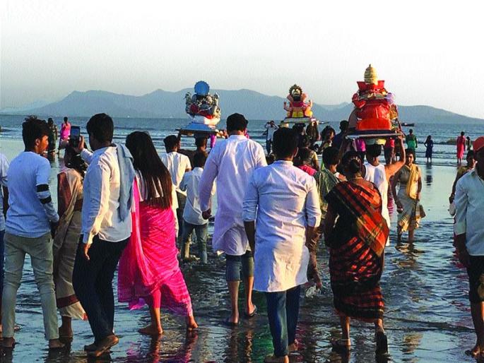 अलिबाग : पाच दिवसांच्या मुक्कामाला आलेल्या बाप्पाला गौरीसोबत सोमवारी भक्तिमय वातावरणामध्ये निरोप देण्यात आला. या वेळी गणपती बाप्पा मोरया... पुढच्या वर्षी लवकर या..., गणपती गेले गावाला... चैन पडेना आम्हाला’ च्या जयघोषाने परिसर दणाणून गेला होता. जिल्ह्यामध्ये ९० सार्वजनिक, तर ५९ हजार ४३ घरगुतीबाप्पाच्या मूर्तींचे आणि १५ हजार ७०० गौरीच्या मूर्तींचे समुद्र, तलाव, नदी या ठिकाणी विसर्जन करण्यात आले. बाप्पाला निरोप देण्यासाठी जिल्ह्यामध्ये विविध ठिकाणी मिरवणुका काढण्यात आल्या होत्या. त्यांच्या जोडीला ढोलताशाचा गजर आणि डीजेच्या दणदणाटाने परिसर चांगलाच दुमदुमून गेला होता. गणेशभक्त बाप्पाच्या मिरवणुकीमध्ये चांगलेच तल्लीन होऊन नाचत होते. विसर्जनस्थळी भाविकांनी प्रचंड गर्दी केली होती.गेले पाच दिवस बाप्पाच्या आगमनाची धूम भक्तांच्या घरामध्ये सुरू होती. आप्तेष्ट, मित्रमंडळी, असा लवाजमा बाप्पाच्या सेवेत तल्लीन झाला होता. सोमवारी सायंकाळी ५ नंतर बाप्पाला विसर्जनस्थळी नेण्यास सुरुवात झाली. समुद्रकिनारे, तलाव, नदी अशा ठिकाणी बाप्पाच्या मूर्तींचे विसर्जन करण्यात आले. त्या वेळी विविध ढोलताशा पथकांनी परिसर चांगलाच दणाणून सोडला होता.जिल्ह्यातील पेण, रोहे, माणगाव, श्रीवर्धन, म्हसळा, महाड, पोलादपूर या ठिकाणी गणेश विसर्जनाच्या मोठ्या मिरवणुका निघाल्या होत्या. त्या ठिकाणीही पारंपरिक सनई, खालुबाजा अशा वाद्यांनी मिरवणुकीत रंगत आणली होती. बहुतांश सार्वजनिक मंडळांच्या मिरवणुकांमध्ये ढोलताशा पथकांचा समावेश करण्यात आल्याचे दिसून आले. वाहतुकीला अडथळा होऊ नये, यासाठी अलिबाग शहरामध्ये समुद्रकिनारी जाणारे मार्ग एका दिशेने केले होते. पोलिसांनी एन्ट्री पाइंटला बॅरीगेट्स लावल्याने अनावश्यक वाहनांना विसर्जनस्थळी जाण्यास मज्जाव केला होता.नागोठणेत अंबानदी घाट, तलावांवर चोख बंदोबस्तनागोठणे शहरासह विभागात आज गौरी आणि गणेशाचा भावपूर्ण वातावरणात विसर्जन सोहळा पार पडला. सोमवारी १ हजार ५५ गणेशमूर्ती आणि ३५० गौरींचे विसर्जन करण्यात आले. दुपारी ३.३०नंतर सुरू झालेला विसर्जन सोहळा रात्री उशिरापर्यंत सुरू होता. शहरात जोगेश्वरी, तसेच शंकर मंदिरासमोरील दोन तलावांसह अंबा नदीत गणेशमूर्तींचे विसर्जन करण्यात आले.अंबा नदीवरील घाटावर नागोठणे ग्रामपंचायतीच्या वतीने विसर्जन सोहळ्यासाठी येणाऱ्या गणरायासह गणेशभक्तांचे आदरपूर्वक स्वागत करण्यात येत होते. सोहळ्यानिमित्त नागोठणे पोलिसांच्या वतीने शहरात विविध ठिकाणी चोख बंदोबस्त ठेवण्यात आला होता.महाडमध्ये विशेष बंदोबस्तमहाड : महाडमध्ये पाच दिवसांच्या गणरायाला भावपूर्ण निरोप देण्यात आला. शहरातील जाखमाता घाट, भोईघाट