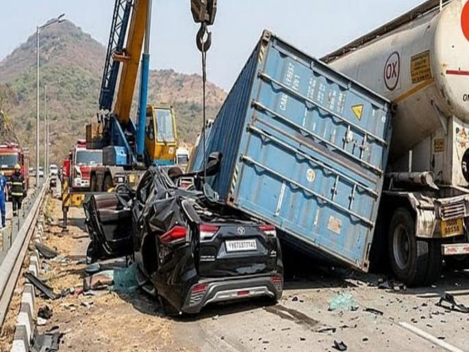 Web Summary : A container truck lost control on the Mumbai-Pune Expressway, crushing multiple vehicles. Three people died instantly when the container overturned onto a car. Five others sustained serious injuries and are receiving treatment. Police have registered a case against the truck driver for negligent driving.