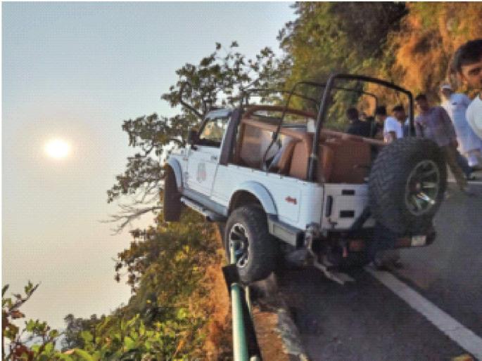 नेरळ : माथेरान घाटात दोन फूट असणाऱ्या सुरक्षा कठड्यावर एक जीप हवेत तरंगत असतांनाचे थरारक चित्र समोर आले आहे. माथेरान घाटातील वॉटर पाईप स्टेशनच्या वरच्या अवघड चढणीला हा अपघात झाला आहे. या गाडीत नऊ प्रवासी प्रवास करत असल्याची माहिती समोर आली आहे. दैव बलवत्तर म्हणून मोठी दुर्घटना टळली.