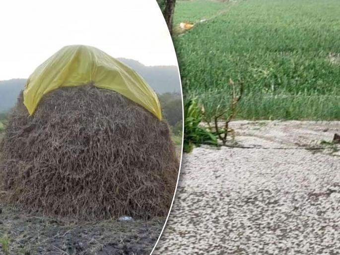 नैसर्गिक आपत्तीतून वाचवलेले पीक खळ्यावर आणून त्याचे उडवे रचले आहेत. पण, मागील शनिवारी संध्याकाळी अचानक अवकाळी पावसाने हजेरी लावली. त्यामुळे शेतकरी धास्तावले आहेत. काही भागात पावसामुळे धान्य तसेच पेंढा काळा पडून कुजून जाऊ नये म्हणून शेतकऱ्यांनी तातडीने खळ्यावर रचून ठेवलेल्या उडव्यांवर प्लास्टिकचे आवरण टाकून झाकून ठेवले आहे.