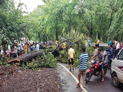 आठवडाभर पावसाने विश्रांती घेतल्यानंतर पुन्हा सुरुवात केली आहे. दोन दिवस सतत पावसाने सुरुवात केल्याने अनेक ठिकाणी जमिनीत दलदल होऊन झाडे कोसळण्याच्या घटना घडल्या आहेत, तसेच गुरुवारी दुपारच्या सुमारात नेरळ-माथेरान घाट रस्त्यात शेकडो वर्षांपूर्वीचे आंब्याचे झाड रस्त्यावर कोसळले. भले मोठे झाड असल्याने सुमारे दोन तास वाहतूक बंद झाली होती आणि त्यामुळे माथेरान घाटात वाहनांच्या रांगाच रांगा लागल्या होत्या. त्यामुळे अनेक प्रवाशांचा खोळंबा झाला.