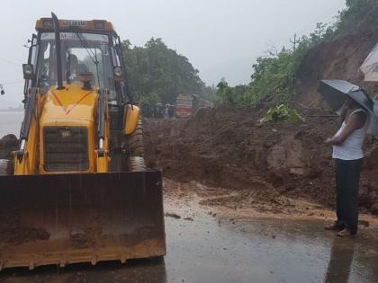 #SpotVisuals Traffic halted on Mumbai-Goa highway following a landslide in Kemburli near Mahad due to heavy rain in the region, road clearing work underway. #Maharashtrapic.twitter.com/7gOkuhmja4