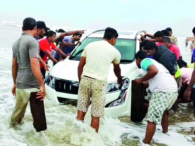 गणपतीपुळे : गणपतीपुळे येथील समुद्रात सोमवारी साताऱ्यातील पर्यटकांची महिंद्रा कंपनीची चारचाकी गाडी अडकली. या गाडीला स्थानिक ग्रामस्थांच्या अथक प्रयत्नाने पाण्याबाहेर काढण्यात यश आले. ही घटना सोमवारी दुपारी १२ वाजण्याच्या सुमारास घडली.सोमवारी गणपतीपुळे येथे दुपारी १२ वाजण्याच्या सुमारास सातारा जिल्ह्यातील पर्यटकांची गाडी चालकाने थेट समुद्र चौपाटीवर नेण्याच्या अतिउत्साही प्रयत्न केला. परंतु हा अतिउत्साह पर्यटकांच्या चांगलाच अंगलट आला.गणपतीपुळे येथील आपटा तिठ्यातून गणपतीपुळे स्मशानभूमीकडे जाणाऱ्या मार्गाने ही गाडी समुद्र चौपाटीवर उतरवली. गाडी चौपाटीवर फिरवू नका, असे अनेक स्थानिकांनी सांगितले. त्याकडे दुर्लक्ष करत प्रथम ही गाडी चालकाने कशीबशी काढून पुन्हा समुद्र चौपाटीवर फिरवण्याचा मोठा अतिरेक केला.मात्र, ही गाडी खोल समुद्राच्या पाण्यात अडकल्याने अखेर या गाडीतील सर्वांनाच स्थानिक ग्रामस्थांकडे मदतीसाठी याचना करावी लागली. त्यानंतर स्थानिक ग्रामस्थांनी माणूुसकीतून ही गाडी पाण्याबाहेर काढण्यासाठी अथक प्रयत्न केले.