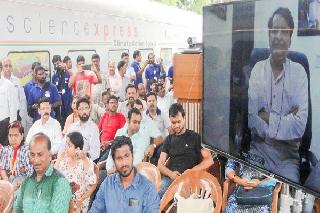 आॅनलाईन लोकमतरत्नागिरी (जि. रत्नागिरी), दि. १५ : भारत सरकारच्या विज्ञान व तंत्रज्ञान विभागातर्फे रत्नागिरी स्थानकात आलेल्या ‘सायन्स एक्सप्रेस’मधील विज्ञान प्रदर्शनाचे उद्घाटन रेल्वेमंत्री सुरेश प्रभू यांनी शुक्रवारी व्हिडिओ कॉन्फरन्सिंगद्वारे केले. त्यानंतर पालकमंत्री रवींद्र वायकर यांच्या हस्ते खासदार विनायक राऊत यांच्या प्रमुख उपस्थितीत या सायन्स एक्सप्रेसचे फीत कापून औपचारिक उद्घाटन करण्यात आले. रत्नागिरी रेल्वे स्थानकाच्या प्लॅटफॉर्म नंबर ३वरील ट्रॅकवर उभ्या असलेल्या १६ बोगीच्या रेल्वेमध्ये हे विज्ञान प्रदर्शन सुरू झाले आहे. यावेळी झालेल्या उद्घाटन कार्यक्रमाला कोकण रेल्वेचे रत्नागिरी क्षेत्रीय प्रबंधक बाळासाहेब निकम, जिल्हा परिषद अध्यक्षा स्नेहा सावंत, रत्नागिरीचे नगराध्यक्ष राहुल पंडित, जिल्हाधिकारी प्रदीप पी., पोलीस अधीक्षक प्रणय अशोक, सेनेचे जिल्हाप्रमुख राजेंद्र महाडिक, रत्नागिरी तालुकाप्रमुख बंड्या साळवी, सेनेचे उपजिल्हाप्रमुख संजय साळवी, रत्नागिरी शहरप्रमुख बिपीन बंदरकर आदी मान्यवर उपस्थित होते.व्हिडिओ कॉन्फरन्सिंगद्वारे उद्घाटन केल्यानंतर रेल्वेमंत्री सुरेश प्रभू म्हणाले, पर्यावरण बदलावर जगभरात मोठ्या प्रमाणात उपाययोजना सुरू आहेत. यासाठी स्थानिक पातळीवरही प्रयत्न होणे गरजेचे असून, त्याचे मार्गदर्शन होण्यासाठीच रेल्वेमधील विज्ञान प्रदर्शन हा उपक्रम देशभरात राबविला जात आहे. पालकमंत्री रवींद्र वायकर म्हणाले, दहा वर्षांपूर्वी सायन्स एक्सप्रेस रत्नागिरीत आली होती. त्यानंतरच्या काळात पर्यावरणात मोठे बदल झाले आहेत. त्यामुळेच यावेळी या सायन्स एक्सप्रेसमधील प्रदर्शनात पर्यावरणातील बदलाची माहिती व त्यावरील उपाययोजना, पर्यावरणातील बदलाशी सुसंगतपणा कसा आणावा, याची माहिती सर्वांना मिळणार आहे. १४ ते १६ जुलैपर्यंत तीन दिवस रोज सकाळी १० ते सायंकाळी ५ वाजेपर्यंत सर्वांना पाहता येणार आहे. शाळांमधील विद्यार्थी, रेल्वे प्रवासी यांनी याचा लाभ घ्यावा, असे आवाहन त्यांनी केले.