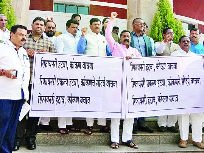 राजापूर : राजापूर तालुक्यातील नाणार - कुंभवडे परिसरातील बाभूळवाडी येथे उभारल्या जाणाऱ्या पेट्रोकेमिकल रिफायनरी प्रकल्पाला विरोध करण्यासाठी शिवसेनेच्यावतीने नागपूर येथे सुरू असलेल्या हिवाळी अधिवेशनामध्ये विधानभवनाच्या पायऱ्यांवर बसून सरकारविरोधात निदर्शने करण्यात आली. यावेळी शिवसेनेच्या आमदारांनी रिफायनरीविरोधात जोरदार घोषणाबाजी करून विधानभवन परिसर दणाणून सोडला.या प्रकल्पाला स्थानिक ग्रामस्थांचा विरोध असून, स्थानिक आमदार म्हणून आमदार राजन साळवी वेळोवेळी हा प्रकल्प रद्द होण्यासाठी पाठपुरावा करत आहेत. रिफायनरी प्रकल्प रद्द करा, रिफायनरी हटवा, कोकण वाचवा अशा घोषणा देत बुधवारी शिवसेनेच्यावतीने नागपूर येथे विधानभवनाच्या पायऱ्यांवर बसून आंदोलन करण्यात आले. हा प्रकल्प रद्द होईपर्यंत ग्रामस्थांच्या पाठीशी राहू, असे आश्वासन देत शिवसेनेच्या आमदारांनी प्रकल्पाविरोधात निदर्शने केली.या आंदोलनात शिवसेना विधानसभेचे गटनेते आमदार सुनील प्रभू, शिवसेनेचे कोकण पक्ष प्रतोद आमदार राजन साळवी, आमदार सदानंद चव्हाण, आमदार भरत गोगावले, आमदार वैभव नाईक, आमदार उदय सामंत, आमदार सुनील शिंंदे, आमदार प्रताप सरनाईक, आमदार तृप्ती सावंत, आमदार मनोहर भोईर, आमदार तुकाराम काटे आदी सहभागी झाले होते.विधानसभेतही चर्चागेले काही दिवस रिफायनरी प्रकल्पाविरोधात शिवसेनेची भूमिका संदिग्ध असल्याचे वातावरण निर्माण झाले असून त्यामुळे शिवसेनेची गोची झाली आहे. त्यामुळे हा प्रश्न उचलण्याचा निर्णय शिवसेनेने घेतला असून विधानभवनातही या मुद्द्यावर चर्चा करण्यात आली.