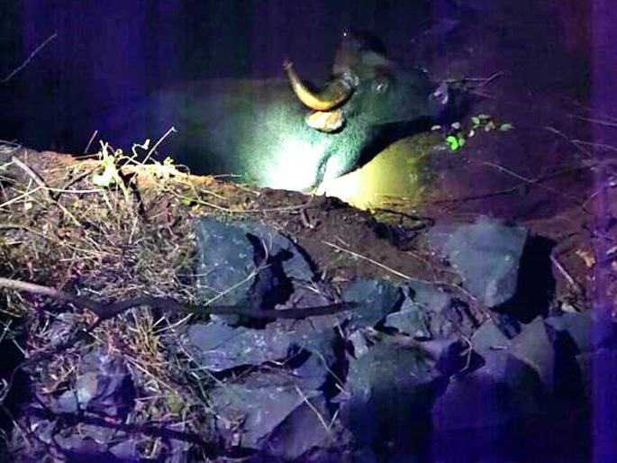 त्यानंतर राजापूरचे वनपाल सदानंद घाटगे, चिपळूणचे रामदास खोत, वि. द. झाडे, राजापूरचे वनरक्षक सागर गोसावी, चिपळूण येथील फिरत्या पथकाचे परिक्षेत्र वन अधिकारी रमेश कांबळे, रत्नागिरीचे परिक्षेत्र वन अधिकारी प्रियंका लगड, दीपक खाडे हे आंगले येथे दाखल झाले. ग्रामपंचायत सदस्य योगेश प्रभुलकर, आयुब मीर, बाळा लाड या स्थानिक ग्रामस्थांनी त्यांना मदत केली.ही विहीर सुमारे बारा ते पंधरा फूट खोल असून, आतमध्ये तीन फूट पाणी असल्याने गव्याला बाहेर काढणे अवघड होते. त्यानंतर खोदलेल्या विहिरीत दगड टाकून आत अडकून पडलेल्या गव्याला बाहेर येण्यासाठी योग्य असा मार्ग बनविण्यात आला. हे काम सुरू असतानाच रानगवा आक्रमक होऊन तेथे असलेल्या मंडळींच्या अंगावर धावून येण्याचा प्रयत्न करीत होता. त्यानंतर तयार केलेल्या त्या पर्यायी मार्गाद्वारे आत पडलेला रानगवा विहिरीतून वर आला आणि जंगलाच्या दिशेने निघून गेला.एका बाजूने खोदकामगव्याला बाहेर काढण्यासाठी जेसीबी बोलावण्यात आला. मात्र, जेसीबी येण्यासाठी लागणारा वेळ लक्षात घेऊन वन विभागाच्या अधिकाऱ्यांनी आपले कर्मचारी व तेथे आलेल्या ग्रामस्थांसह त्या विहिरीच्या एका बाजूने खोदण्यास सुुरूवात केली.