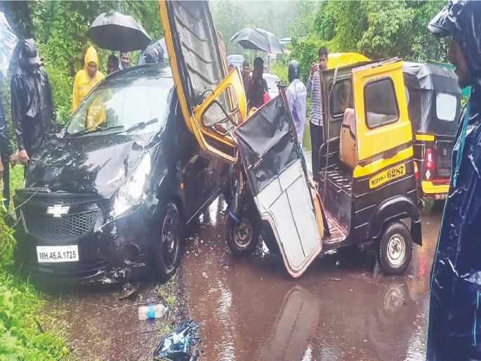 चिपळूण : चिपळूण-गुहागर मार्गावर रिगल कॉलेजनजीक भरधाव वेगाने निघालेल्या कारने डमडम आणि रिक्षाला धडक दिली. हा अपघात चिपळूण-गुहागर मार्गावर मंगळवारी (४ जुलै) दुपारी १२:३० वाजण्याच्या सुमारास झाला. या तिहेरी अपघातात नऊजण जखमी झाले आहेत. यामध्ये दोन विद्यार्थ्यांचा समावेश आहे, तर एक विद्यार्थी गंभीर जखमी झाला आहे. डमडममधील २० दिवस व सहा महिन्याची दोन बालके दैव बलवत्तर म्हणून बचावली आहेत. गोवळकोट रोडकडून गुहागरच्या दिशेने जाणारी कार रिगल कॉलेजच्या अलीकडे आली असता समोरून गुहागरकडून येणाऱ्या डमडमला कारने जोरदार धडक दिली. या धडकेनंतर ही डमडम प्रवाशांसह रस्त्याच्या बाजूला जाऊन कलंडली. त्यानंतर भरधाव कारने समोरून येणाऱ्या रिक्षालाही जोरदार धडक दिली आणि रिक्षा पलटी झाली.या अपघातात गुहागर तालुक्यातील कोंडकारूळ येथील सुभाष कृष्णा अडूरकर (वय २६), प्रतीक जाक्कर, डमडम चालक अमर मोरे (रा. वेळणेश्वर), सिया अडूरकर हे किरकाेळ जखमी झाले आहेत. तसेच चिमुकल्या मुली रिया जाक्कर व उर्वी जाक्कर या सुदैवाने बचावल्या. उर्वरित लोकांना किरकोळ दुखापत झाली.तसेच रिक्षामधील चालक संजय साबळे (रा. कोंढे माळवाडी) यांना गंभीर दुखापत झाली आहे. अपघातात विद्यार्थी रूद्र भारद्वाज हा गंभीर जखमी झाला असून, त्याला अतिदक्षता विभागात ठेवण्यात आले आहे, तर एक मुलगी किरकोळ जखमी झाली आहे. अपघात झाल्यानंतर या कारच्या चालकाने पळण्याचा प्रयत्न केला हाेता. मात्र, पाेलिसांनी त्याला ताब्यात घेतले आहे.या अपघाताची माहिती मिळताच पोलिस घटनास्थळी दाखल झाले. यानंतर जखमींना तत्काळ येथील लाईफ केअर रुग्णालयात उपचारासाठी दाखल करण्यात आले. या प्रकरणी अधिक तपास पोलिस करत आहेत. या अपघातात रिक्षा व डमडमचे मोठे नुकसान झाले आहे.