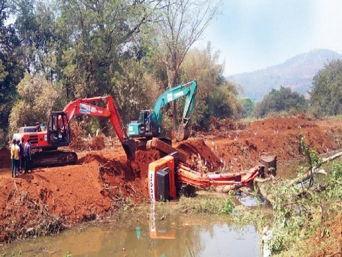 पूरमुक्तीसाठी युद्धपातळीवर काम, शिवनदीतील गाळ काढताना ‘नाम’चा पोकलेन कलंडला नदीत