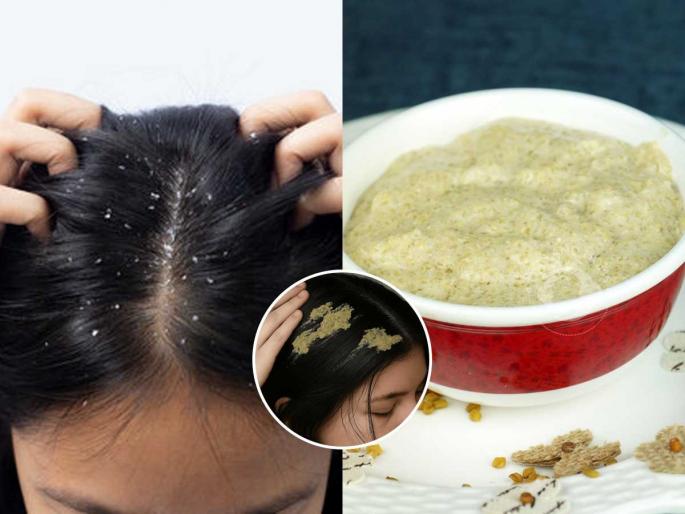 केसांतील कोंडा घालवण्यासाठी आपल्याला २ ते ३ चमचे मेथीचे दाणे रात्रभर भिजवावे लागतील. दुसऱ्या दिवशी सकाळी मिक्सरमध्ये बारीक करुन पेस्ट तयार करा. यात २ चमचे दही मिसळून हेअर पॅक तयार करा. हा हेअर मास्क केसांना लावा. हा पॅक हातांच्या मदतीने टाळूवर लावा. नंतर टाळूवर हलक्या हाताने मसाज करा. ३० मिनिटे लावल्यानंतर केस पाण्याने धुवा. आठवड्यातून १ ते २ वेळा लावल्यास कोंड्याची समस्या कमी होताना दिसेल.