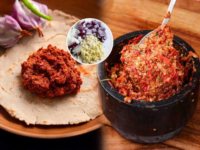 ३. मिक्सर वापरला तरी चालेल. ठेचून केले तर उत्तम. कारण ठेचून केल्यावर त्याला जसा जाडसरपणा येतो तो मिक्सरमध्ये येत नाही. मिक्सरमध्ये वाटत असाल तर एकदाच बटण फिरवू नका. चालू बंद, चालू बंद करुन वाटा. त्यासाठी भांड्यात किंवा ठेचण्यासाठी शेंगदाणे, सुकं खोबरं, कांदा, सारे पदार्थ एकत्र करायचे. त्यात चवीपुरते मीठ घालायचे. तसेच दोन ते तीन चमचे लाल तिखट घालायचे. मस्त ठेचून घ्यायचे. भाकरी , चपाती किंवा भातासोबत खायचे.