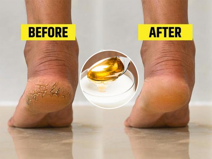 मध एक नैसर्गिक मॉइश्चरायझर आणि अँटीबॅक्टेरियल पदार्थ आहे, तर दूध त्वचेला मऊ बनवते. मध आणि दूध एकत्र करून एक गुळगुळीत पेस्ट तयार करा. हे मिश्रण टाचांवर लावा आणि २० ते २५ मिनिटे तसेच राहू द्या. त्यानंतर, कोमट पाण्याने पाय धुवा. हा उपाय केल्याने टाचांवरील भेगांचे प्रमाण कमी होऊन त्वचा मऊ - मुलायम होते.